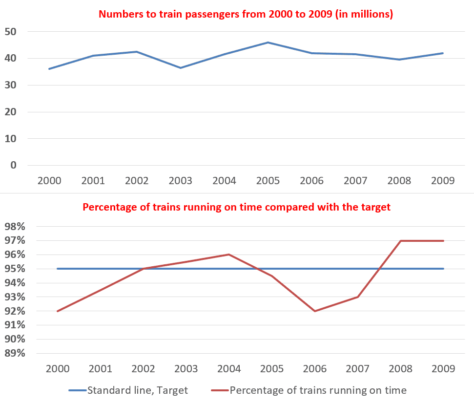 - Task 1: The first graph shows the number of train passengers from 2000 to 2009; the second compares the percentage of trains running on time and target in the period.