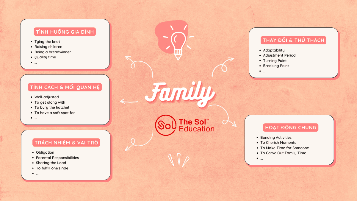 Gia đình là một chủ đề phổ biến trong IELTS. Trong bài viết này, SOL sẽ chia sẻ với các bạn những từ vựng IELTS hữu ích chủ đề Family. Đặc biệt, SOL đã phân loại và chia các từ thành nhiều khía cạnh để các bạn có thể lập sơ đồ tư duy từ vựng, giúp việc học hiệu quả và dễ nhớ hơn. Các bạn hãy cùng tìm hiểu nhé.