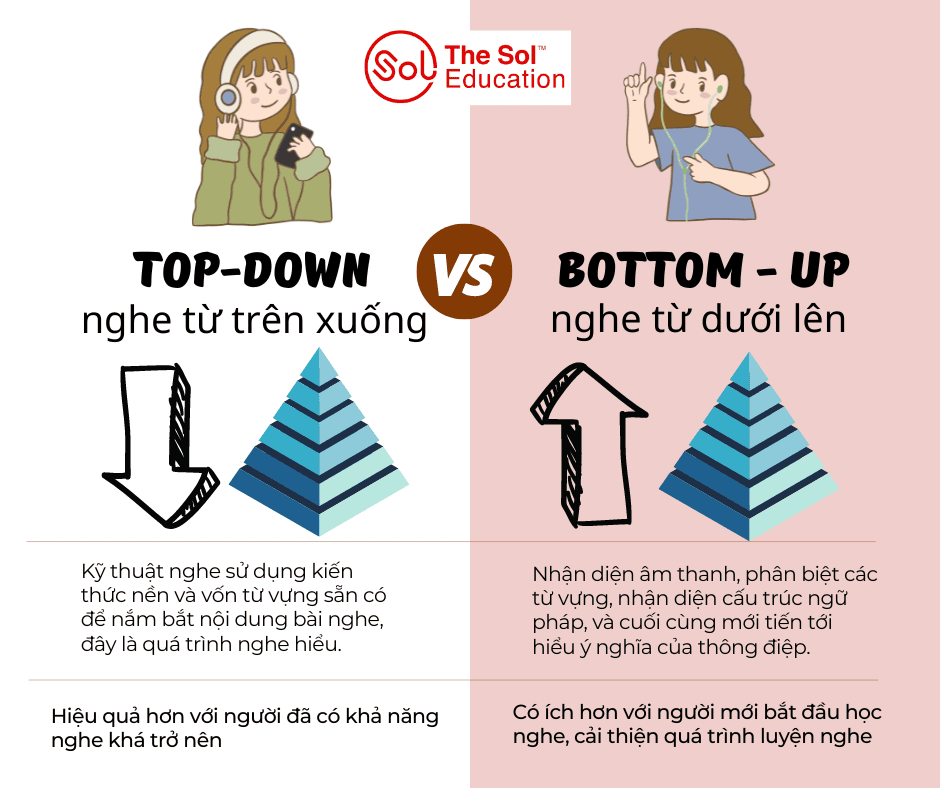 Với kỹ thuật nghe bottom – up thì người nghe sẽ nhận diện ý nghĩa các âm mình được nghe để phân biệt từ đó với các từ khác, rồi tiếp tục quá trình giải mã đến khi hiểu được nội dung bài nghe. Để làm được điều này thì trước khi luyện nghe, chúng ta cần nắm vững một số yếu tố cơ bản như ngữ pháp, từ vựng, phát âm. Bạn có thể vừa bổ sung đồng thời các yếu tố này, vừa luyện nghe với những file nghe nội dung đơn giản, tốc độ chậm rồi sau đó nâng dần độ khó. Như vậy, việc nghe tiếng Anh sẽ không còn là nỗi ám ảnh kể cả khi bạn mới ở level cơ bản nhất.