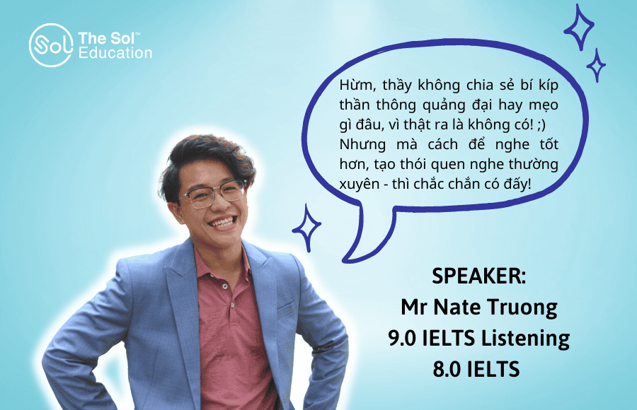 Với diễn giả là một giáo viên giàu kinh nghiệm và đam mê nghiên cứu, tìm ra phương pháp giảng dạy hiệu quả cho học trò, Mr Nate Trương sẽ giúp các bạn khắc phục điểm yếu nghe của bản thân và lên cho mình một kế hoạch luyện nghe xịn xò để nâng trình "thần tốc" trong thời gian ngắn đó!