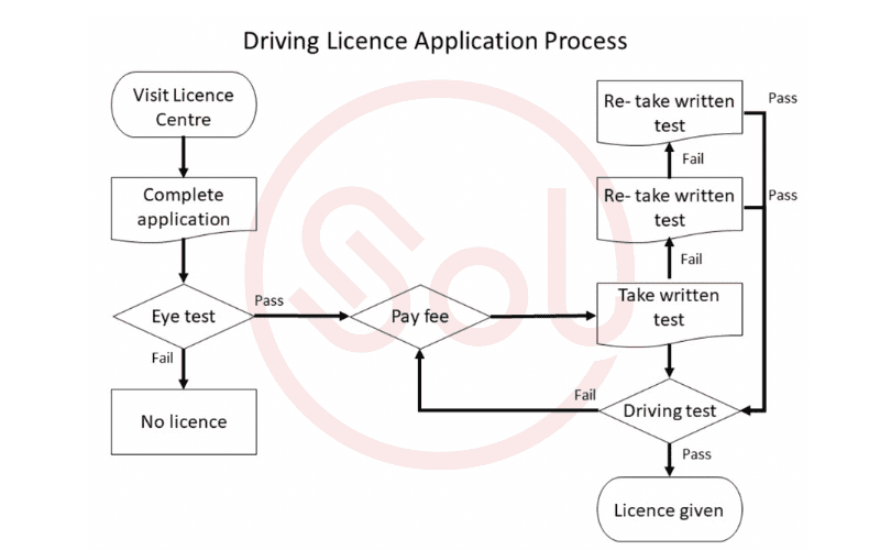 The diagram below shows the usual process a person must go through when applying for a driving licence in one state in the US. Summarise the information by selecting and reporting the main features, and make comparisons.