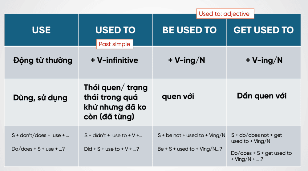 - Câu phủ định: don’t/doesn’t/didn’t get used to.