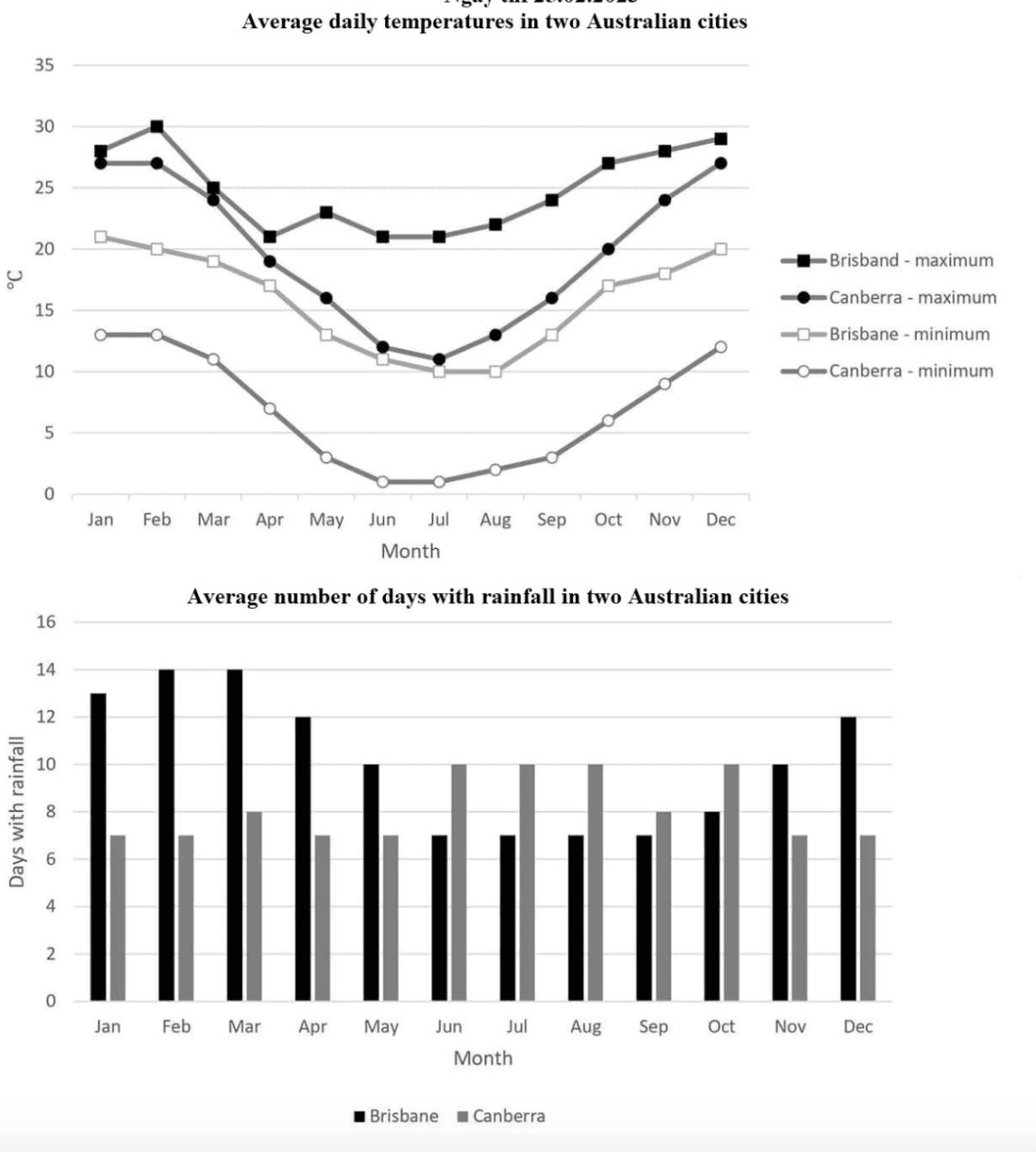 The provided graph displays the average daily maximum and minimumtemperatures in degrees Celsius (°C) for Brisbane and Canberra, while the accompanying chart illustrates the average number of days with rainfall in each city per month.