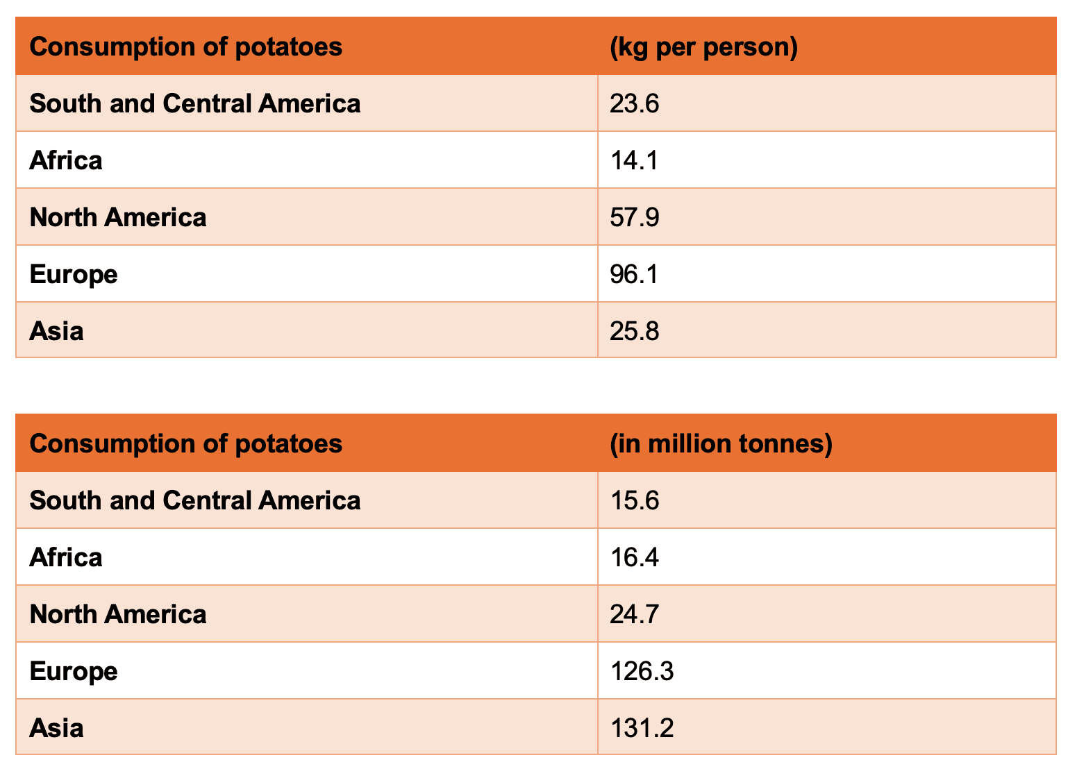 The tables illustrate the consumption and production of potatoes in five different regions of the world in 2006. The first table shows the average consumption per person in kilograms, while the second table provides the total potato consumption in million tonnes.