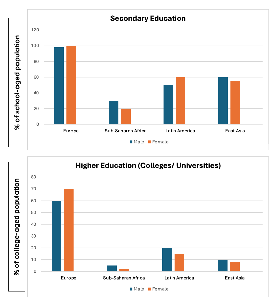 A similar pattern was observed in higher education. Europe again had the highest participation rates, with 60% of men and 70% of women enrolled in tertiary education. In contrast, Sub-Saharan Africa had the lowest figures, with only 5% of men and 2% of women. Latin America and East Asia recorded lower rates than Europe, remaining below 20% for both genders. Notably, in all regions except Europe, male students outnumbered female students in higher education.