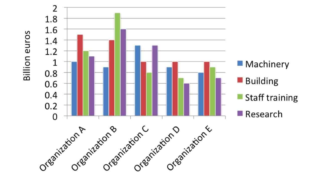 The bar chart illustrates the monetary investments made by five different organizations in four distinct categories, namely machinery, building, staff training, and research, with values presented in billion euros.