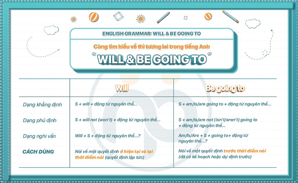 Để dễ hình dung sự khác nhau giữa will và going to, các bạn có thể tham khảo bảng tóm tắt dưới đây nè: