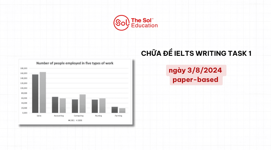 The bar chart shows the number of people working in five different occupations - Sales, Accounting, Computing, Nursing, and Farming - in 2001 and 2008.