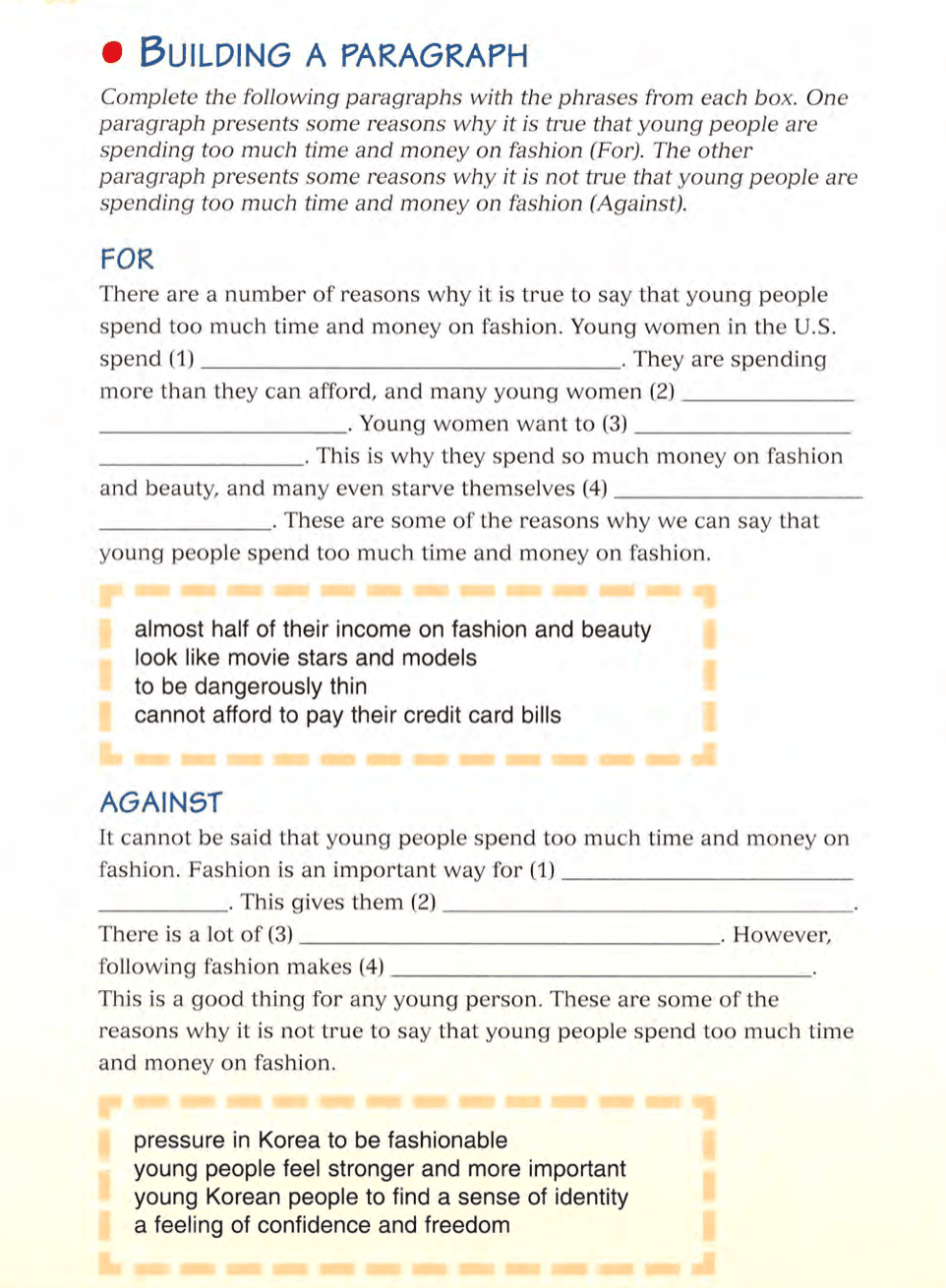 - Building a paragraph: Người học sẽ được hoàn thành đoạn văn với các từ vựng cho sẵn ở cả 2 quan điểm.