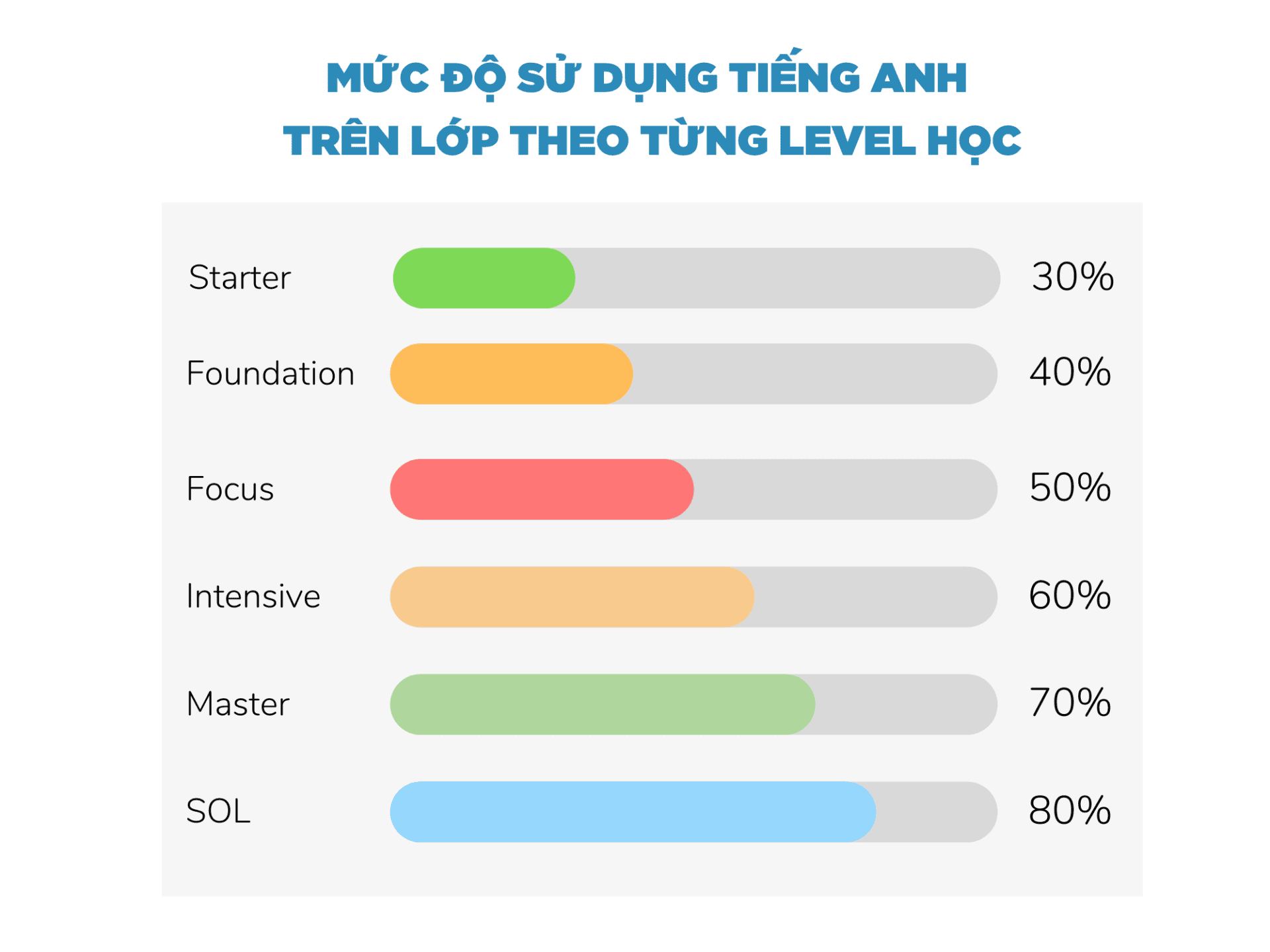 Tại The SOL, giáo viên chỉ có vai trò gợi mở, dẫn dắt, tổng kết, còn học sinh mới chính là người kiến tạo nên bài học, làm chủ ngôn ngữ. The SOL nỗ lực để tạo dựng môi trường học tập SÁNG TẠO - HIỆN ĐẠI - LẤY HỌC SINH LÀ TRUNG TÂM, đẩy mạnh sự tương tác tối đa giữa người học và giáo viên, người học với người học, người học và thế giới. Chúng tôi cũng cam kết môi trường sử dụng tiếng Anh theo từng level (cấp độ) học tập khác nhau: