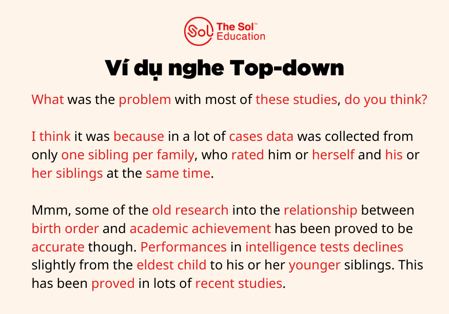 Các từ màu đỏ trên ví dụ trên chính là các từ mà người học ở level trung cấp có thể nghe được. “What”, “problem”, “these studies”, “do you think” bạn nghĩa đâu là vấn đề của những nghiên cứu này? Tương tự như vậy, chúng ta cũng có thể chỉ cần nghe được những từ được bôi đỏ ở đoạn thứ 2 để đoán được nội dung của cả câu: bởi vì nhiều dữ liệu chỉ lấy từ một người anh chị em trong gia đình.