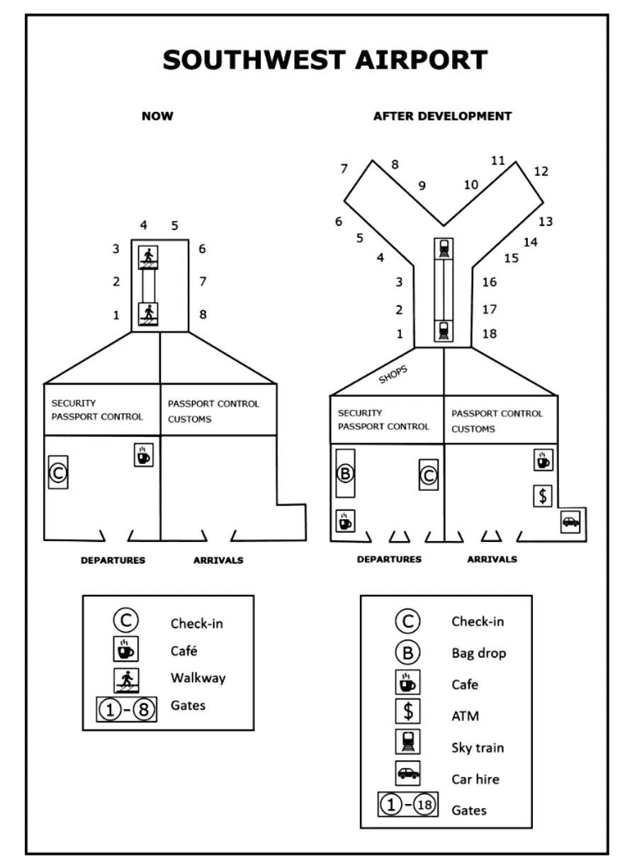 The plans below show the site of an airport now and how it will look after redevelopment next year. Summarise the information by selecting and reporting the main features and make comparisons where relevant.